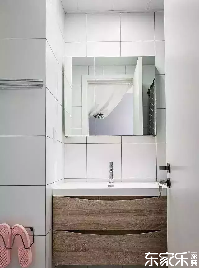 衛(wèi)生間簡(jiǎn)單干凈,給人一種寧?kù)o感。嵌入式的洗手盆設(shè)計(jì),不僅可以減少空間占用,同時(shí)使用起來(lái)非常方便。懸空的浴室柜可以減少衛(wèi)生死角,方便日常打掃。