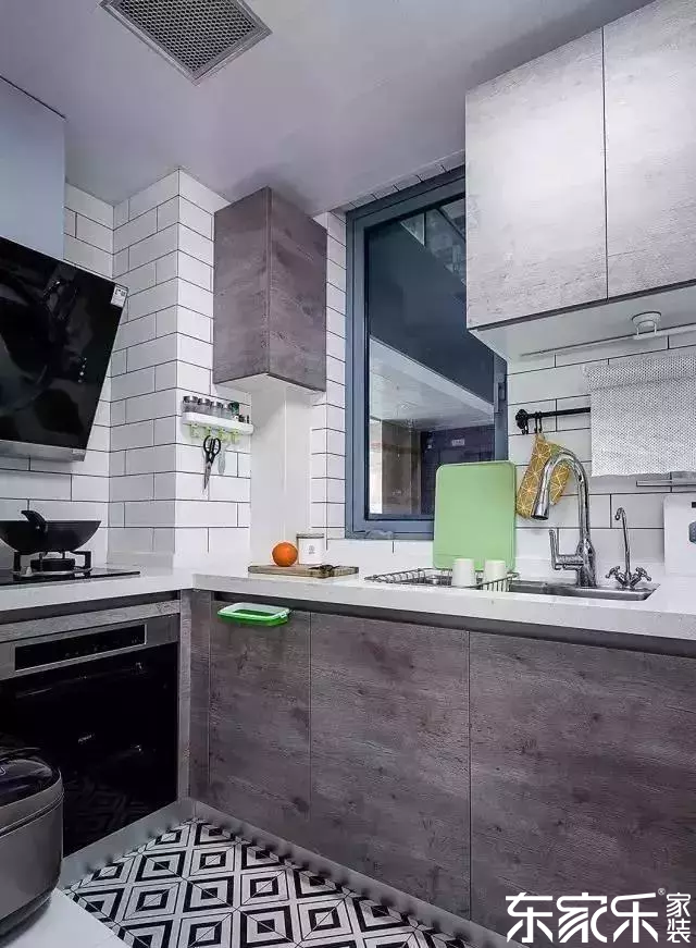 廚房采用L型的設(shè)計(jì),做了櫥柜和吊柜方便收納,還見(jiàn)縫插針的安置掛架,墻面貼了北歐風(fēng)的白色小瓷磚,地面是幾何圖案的黑白地磚,容易清理的同時(shí)又很時(shí)尚。