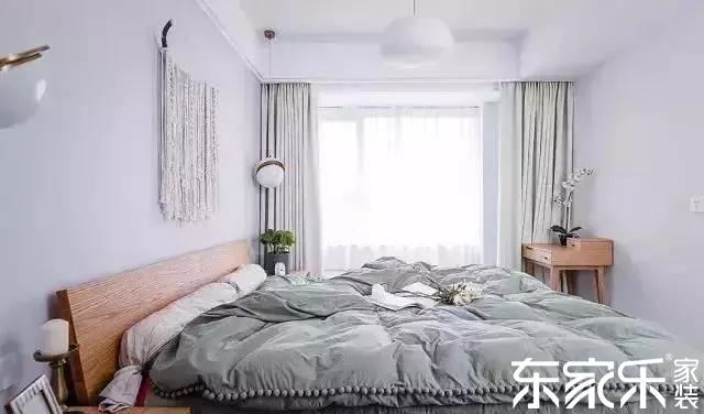 大大的窗子,灰色的窗簾,很文藝的感覺(jué)。臥室里是原木的大床,還有原木的柜子,搭配同樣是灰色的床鋪,很安靜,很悠閑。別致的床頭燈真的非常有設(shè)計(jì)感。在床頭背景墻上掛了掛毯,簡(jiǎn)簡(jiǎn)單單的掛毯更加浪漫。